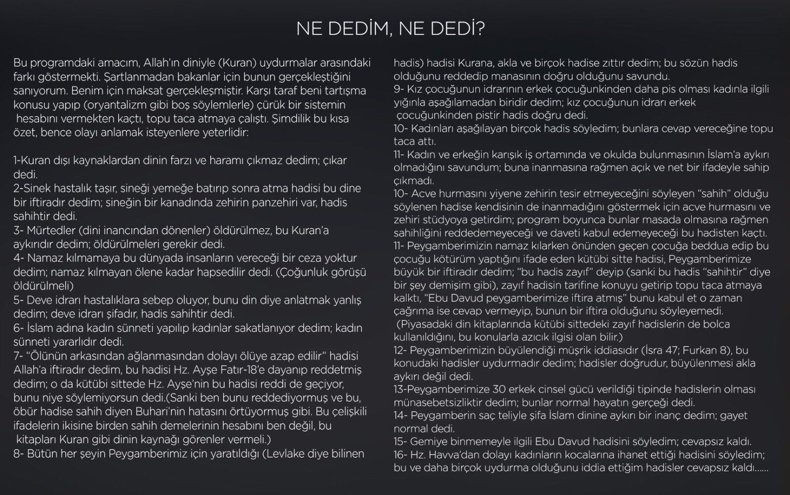 Programın müslümanlara hiçbir faydası olmadı. Sosyal medyada görüyorum hadis inkarcılığı iyice artmış. Sifil bey keşke çıkmasaydı o programa.